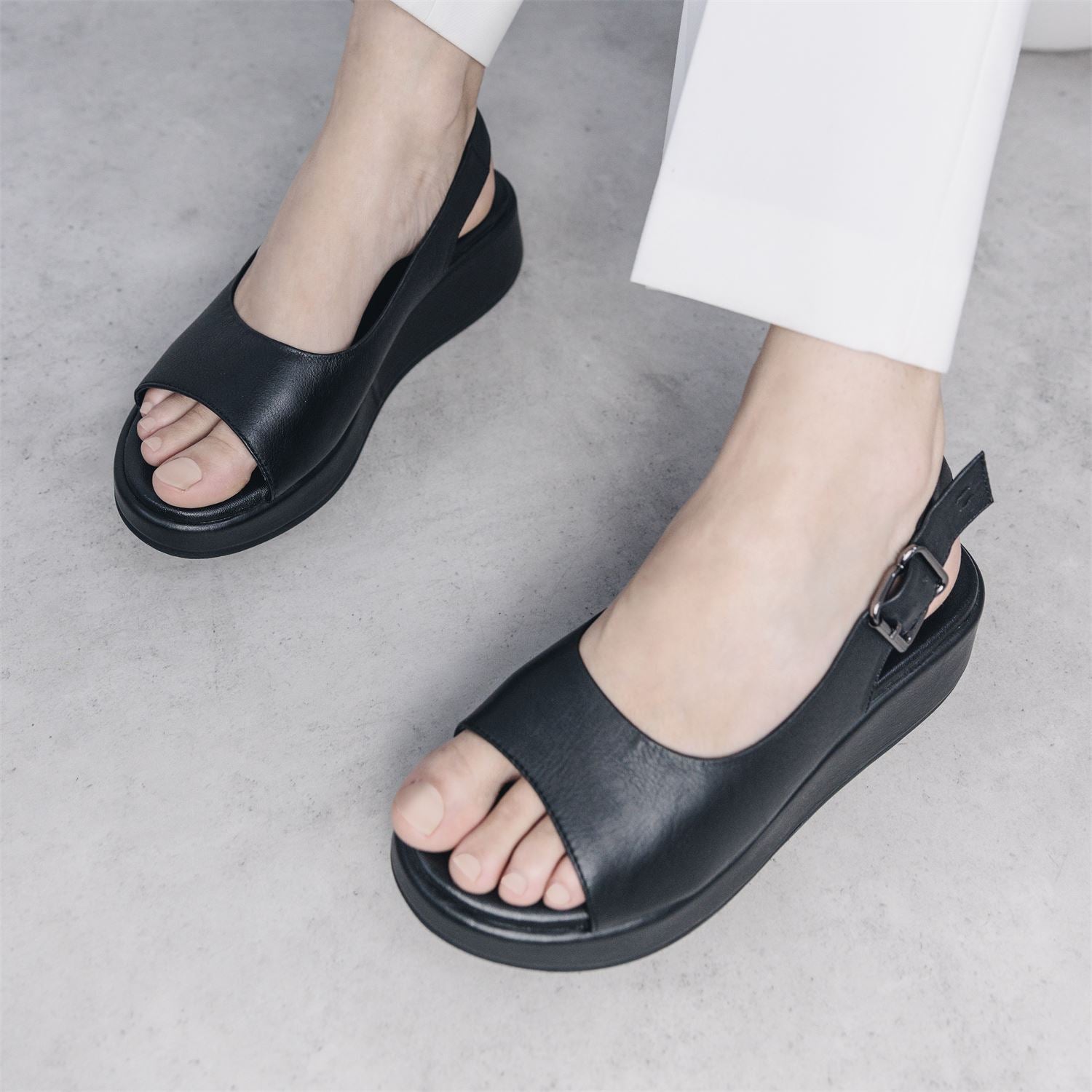 • Contemporary low wedge profile with sling strap.