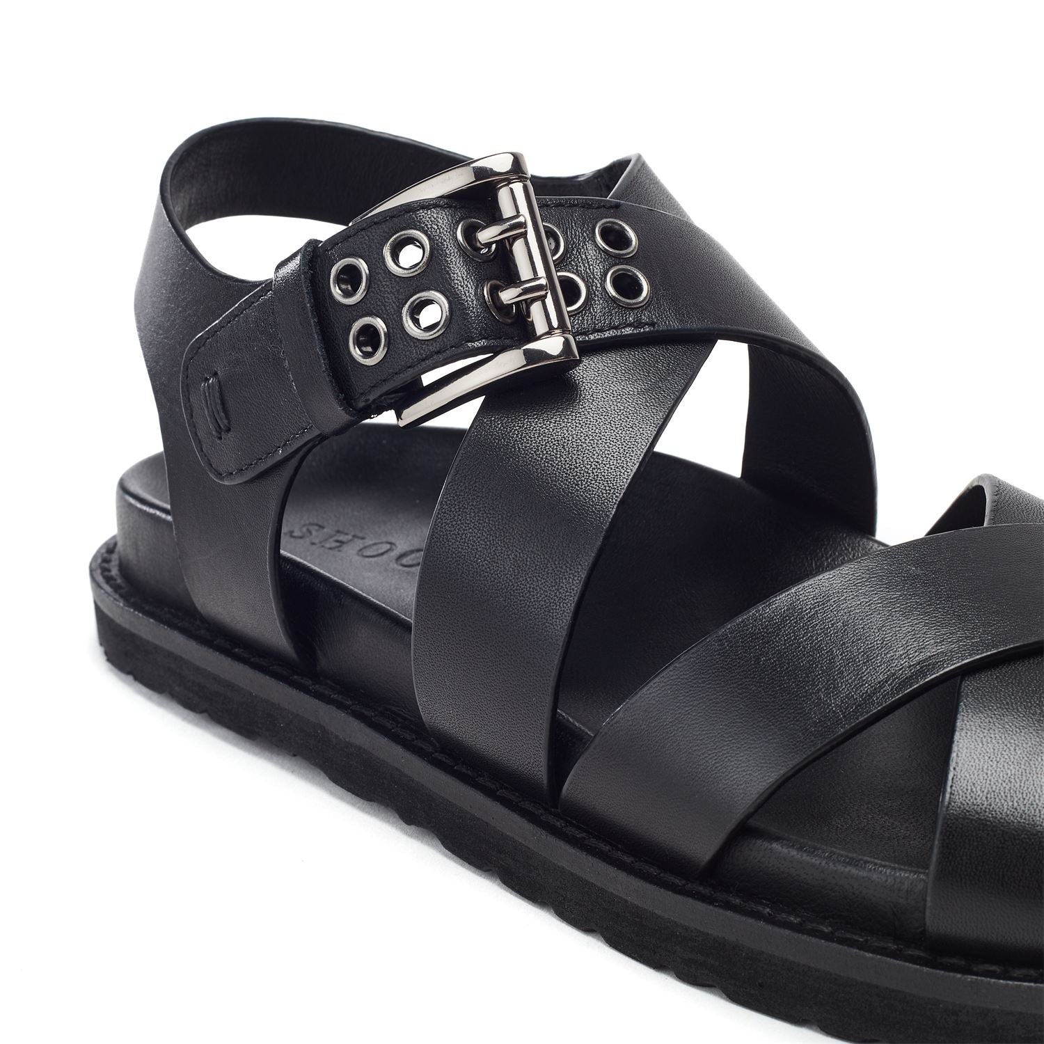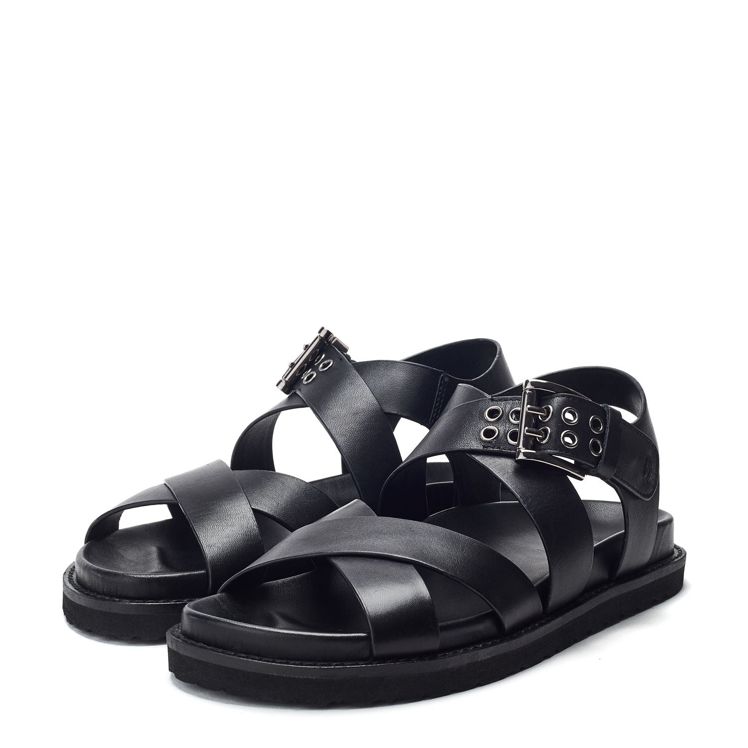 - Featuring a stylish cross strap design this sandal offers a secure and adjustable fit ensuring comfort with every step.